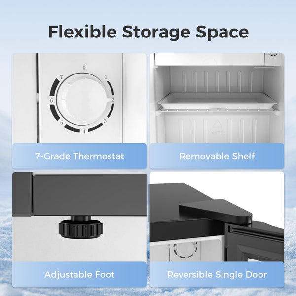 • Golden capacity, compact and does not take up space: 2.90cu.ft refrigeration & 0.30cu.ft freezing dual-zone configuration, scientific division of fresh and frozen space; 17.52"W x 19.29"D x 30.71"H, small space can also realize large-capacity storage.