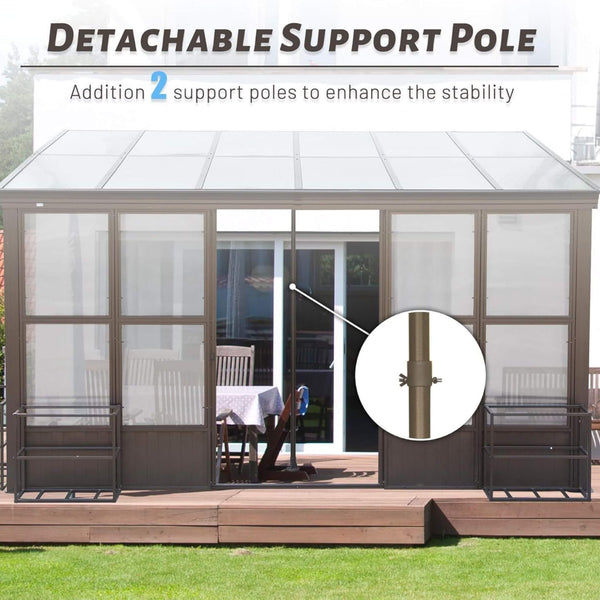 Designed with expert craftsmanship, this solarium features scratch-resistant, powder-coated aluminum construction that promises years of reliable use. Its polycarbonate screens provide superior protection against wind and rain while ensuring privacy, and the mesh screens promote fresh air circulation while keeping unwanted pests out. Whether you’re entertaining, dining, or relaxing, the convenience of its double sliding doors and modular, detachable design lets you customize the space to your liking.