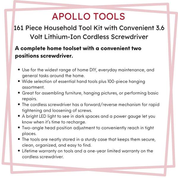 APOLLO HAND TOOL LIFETIME WARRANTY: Our hand tools are drop forged for strength, chrome plated to resist corrosion and have non-slip comfort grip handles for extra torque and will last a lifetime under normal use. The hand tools come with a limited lifetime warranty and a one-year warranty applies to the cordless screwdriver. Click on this link to register your Apollo Tools product.