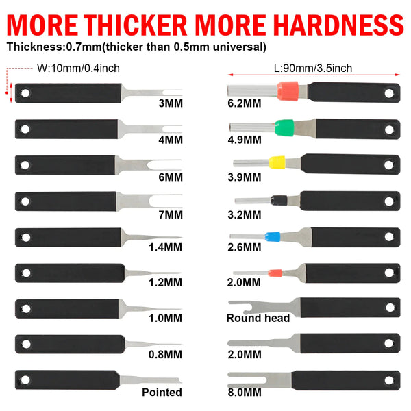 The terminal removal tool is made of premium quality stainless steel, Thickness 0.7mm, More Durable & More thicker than 0.5mm universal Terminal tool kit