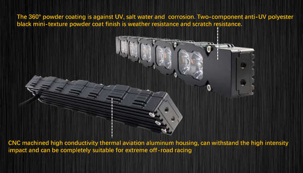 - Housing is upgraded to 304 aluminum. The surface is UV polyester powder coated to prevent against UV, salt water, corrosion, fading and scratch resistant.