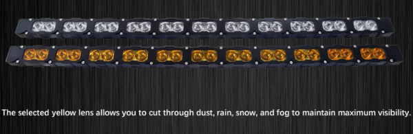 Yellow LED -- used in poor driving conditions such as dust, fog, snow and rain. It reflects through air particles much less than the white light. Therefore, making it ideal for poor driving conditions. For off road use only.