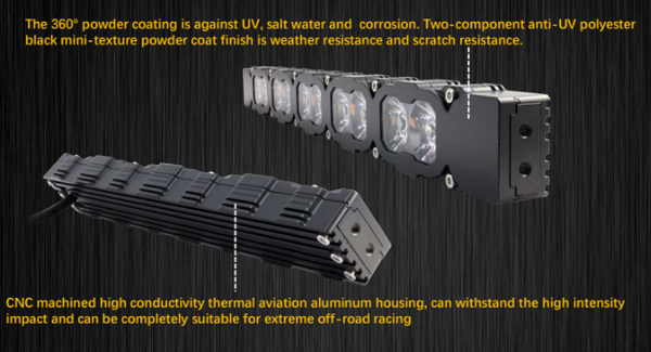 - Housing is upgraded to 304 aluminum. The surface is UV polyester powder coated to prevent against UV, salt water, corrosion, fading and scratch resistant.