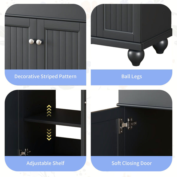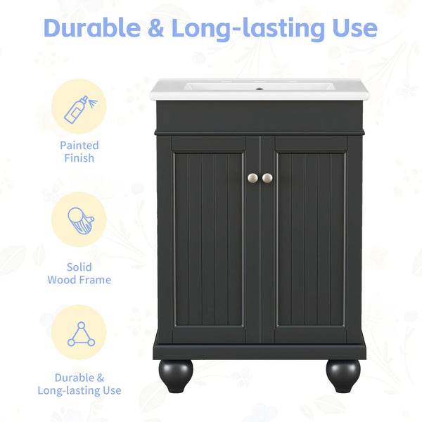 The vanity's frame is crafted out of solid wood and features painted finish, with groove pattern design, ball feet, and metal hardware for an added element of beauty and grace.
