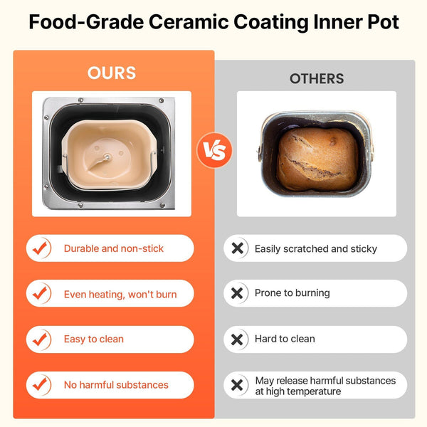 Food-Grade Ceramic Inner Pot: The inner pot is crucial for your health and safety. We use a food-grade ceramic inner pot, which is heat-resistant and will not release harmful substances. It is durable, non-stick, and the coating is not easy to peel off, ensuring no burning even after prolonged use. The mixing blade is also made of food-grade Teflon material, which is safe and harmless. Every baking process takes care of your health, ensuring peace of mind with every bite.