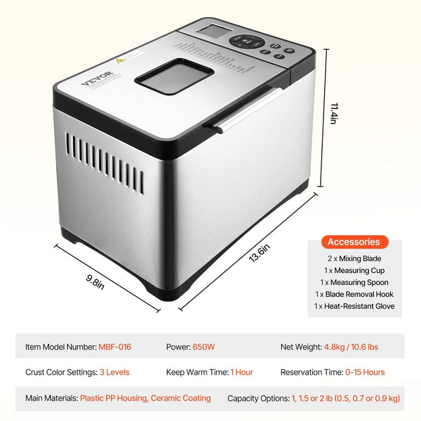 3 Capacities & 3 Crust Colors: The bread machine offers three capacity options, with 1 pound suitable for 1-2 people, 1.5 pounds for 2-4 people, and 2 pounds for 4-6 people, eliminating any portion-related worries. Additionally, you can choose from 3 different textures: light for a soft texture, medium for a sweet crust, and dark for a crispy crust, offering a variety of delicious tastes.