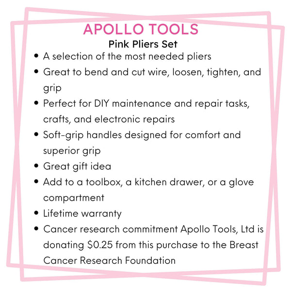 AN APPRECIATED GIFT IDEA. The Apollo Tools pink pliers make an excellent gift or stocking stuffer, as a set of three or on their own. They are easy to add to a tool box, a kitchen drawer or a glove compartment. Check out our pink hammer, wrenches, screwdrivers, tape measure, level, and more and create your own custom pink tool set.