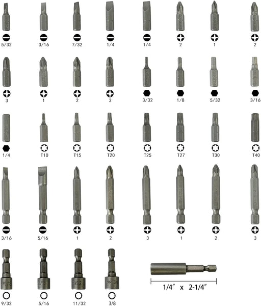 What You Get This KEEGAN TOOLS 37-Piece hardened tool bit set is comprised of the following: 2” long Slotted bits 3/16”, 1/4”. 2” long Phillips bits – (2) #1s, (2) #2s, (2) #3s. 1” long Slotted bits 5/32”, 3/16”, 7/32”, (2)1/4”. 1” long Phillips bits (2) #1s, (3) #2s, (2) #3s. 1” long Hex bits 3/32”, 1/8”, 5/32”, 3/16”, 1/4”. 1” TORX bits T10, T15, T20, T25, T27, T30, T40. Hex Nut Driver Socket bits with 1” shafts 9/32”, 5/16”, 11/32”, 3/8”. One 2-1/4” long magnetized bit holder