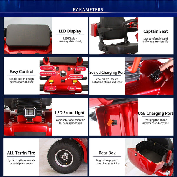 - Equipped with a rheostat, speedometer, horn, reverse gear, a key with remote, a spacious storage basket, and an adjustable seat, this all-terrain mobility scooter is perfect for your lifestyle.