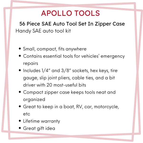 THE GIFT OF SAFETY: The competitive price of our 56-piece Auto Tool Kit makes it a fantastic gift for family members and friends. Parents like to give it to their kids when they drive their first car. This kit represents peace of mind for the whole family, and its cost makes it possible to throw one in each of the household’s vehicles: boat, RV, car, motorcycle, etc.
