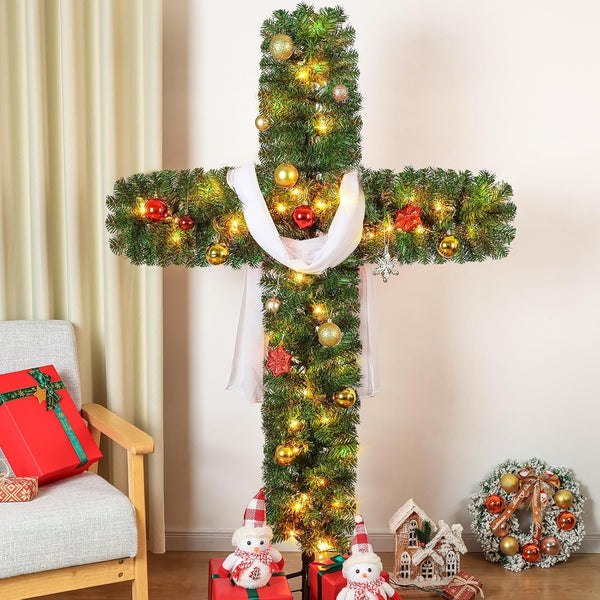 - 72 Inch Christmas Cross Tree with 100 Lights and a White Silk Scarf Christmas Christian Decorations Indoor Jesus Christ Catholic Cross Decor He is Risen for Home Decor