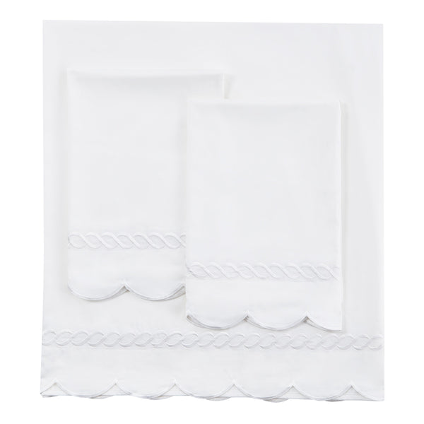 Our 600 thread count sateen sheet set is woven with extremely fine yet durable long staple cotton, producing an exceptionally smooth and soft sheet. We added an embroidered scalloped edge to our classic rope embroidery for extra style, and generously cut the fitted sheets to fit mattresses up to 18" deep. Exceptional quality and elegance, all at a comfortable price.