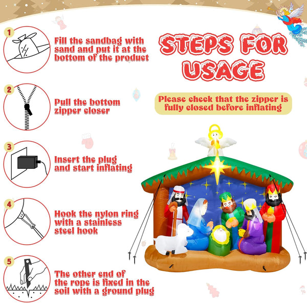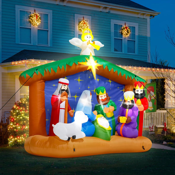 - Christmas Inflatable Nativity Scene - Spanning 8 feet in length, this charming inflatable Nativity scene showcases Mary and Joseph celebrating the birth of Jesus, complete with adorable sheep, reverent angels, and the three wise men bestowing their blessings