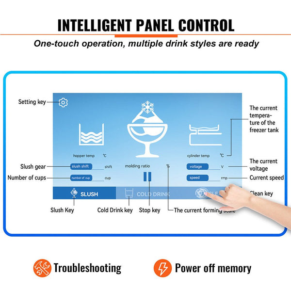 - Equipped with concise control panel with clear digital temperature display, on-off switch, separate mixing switches, two modes and cylinder indicator buttons for carefree operation. Cold drink and slushy modes can be switched as need.
