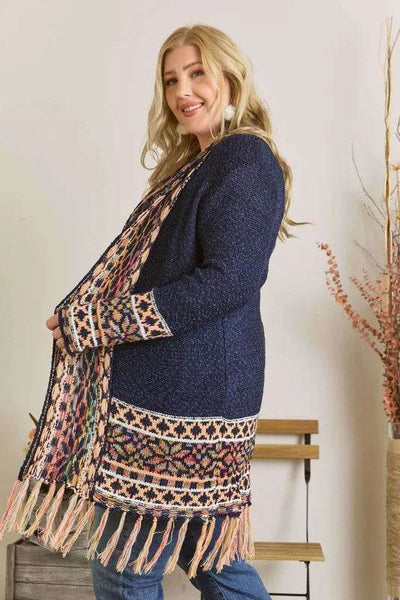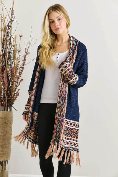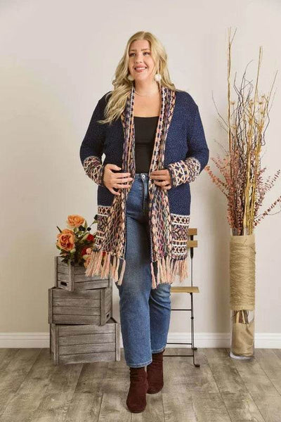 This Fringe Hem Aztec Border Cardigan features a unique Aztec border design with trendy fringe detailing along the hem. Perfect for adding a bohemian flair to your outfit, this cardigan is both stylish and eye-catching. The fringe hem adds a playful and fun touch, making it a statement piece for a fashionable and cozy look.