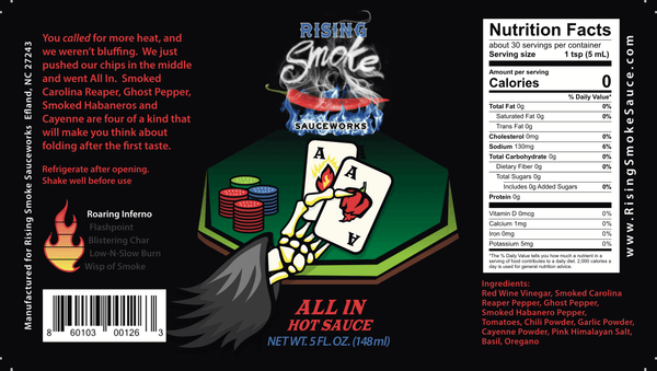 All In is our boldest and most intense hot sauce experience yet. Brace yourself for a fiery fusion of habaneros and ghost peppers, followed by the relentless heat of smoked Carolina Reapers. But this sauce is not just about the scorch – it's a symphony of smoky and savory flavors, thanks to a carefully crafted blend of tomatoes, spices, and a touch of red wine vinegar. Perfect for true chili heads seeking both heat and depth of taste, "All In" is a flavor-packed adventure that ignites your senses from the first drop.