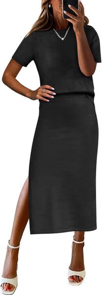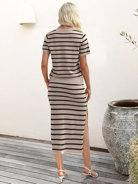 - Features - The 2 piece outfits matching sets include short sleeve pullover top and midi pencil skirts that can be matched with other items. The knitted 2 piece sweater skirt sets for women feature in solid and striped colors. Crew neck, short sleeves, the midi skirt a flattering split hem design, the sweater skirt sets going out travel outfits are suitable for daily life,work,street,school,vacation.