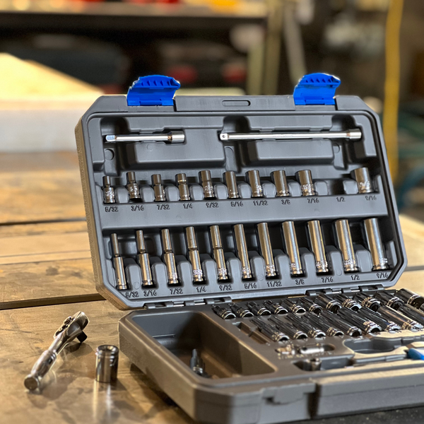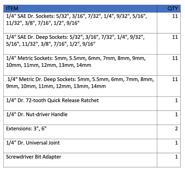 - Eleven 1/4" SAE Dr. Sockets: 5/32", 3/16", 7/32", 1/4", 9/32", 5/16", 11/32", 3/8", 7/16", 1/2", 9/16"