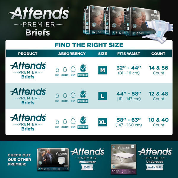 Attends Premier Tab Style Briefs are high absorbency briefs designed for people with heavy to severe urinary and/or fecal incontinence. With a capacity of up to 4 liters (over 140 oz.), these briefs will easily see you through a full day or night. Note that real-life performance may differ.