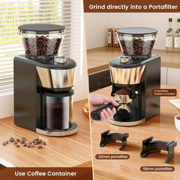 - Find the Right Grind for Your Taste: Customize your brew with 35 grind settings, from ultra-fine espresso grind to coarse grounds for French press coffee. Our burr coffee grinder delivers precision for all brewing styles. Includes 58mm and 52mm portafilter holders for direct grinding, allowing professional quality espresso preparation.