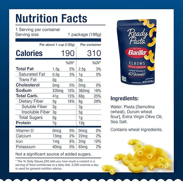 BARILLA Ready Pasta Elbows pasta is a fully cooked pasta that's ready in the microwave in just 60 seconds. Made with 3 simple ingredients—a dash of extra virgin olive oil, a pinch of sea salt and authentic BARILLA pasta—Ready Pasta has no preservatives and is non-GMO certified. Simply heat the pouch in the microwave then add your favorite pasta sauce or toppings for a quick and delicious dish or pasta meal.