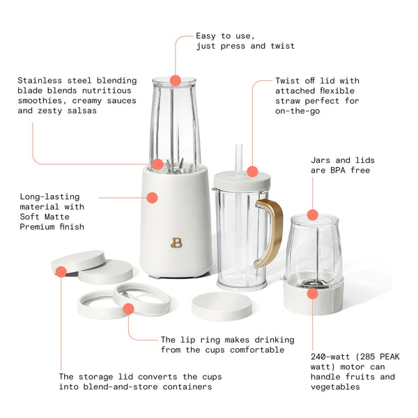As easy as press and twist. The beautiful 12 piece personal blender will be your go to smoothies, sauces, salsas and more. Take your smooties anywhere in the 16oz togo travel cup with handle and drew's signature no drippy sippy flexible straw and twistoff lid. Featuring a durable stainless steel blending blade, grinding blade, and 285 peakwatt motor that can even grind up coffee beans and spices. With dishwashersafe parts for hasslefree cleaning, this personal blender will be your new favorite countertop companion. Created by drew barrymore, beautiful kitchenware combines elegant design, contemporary colors and modern silhouettes for highperformance appliances that look beautiful on your kitchen counter.