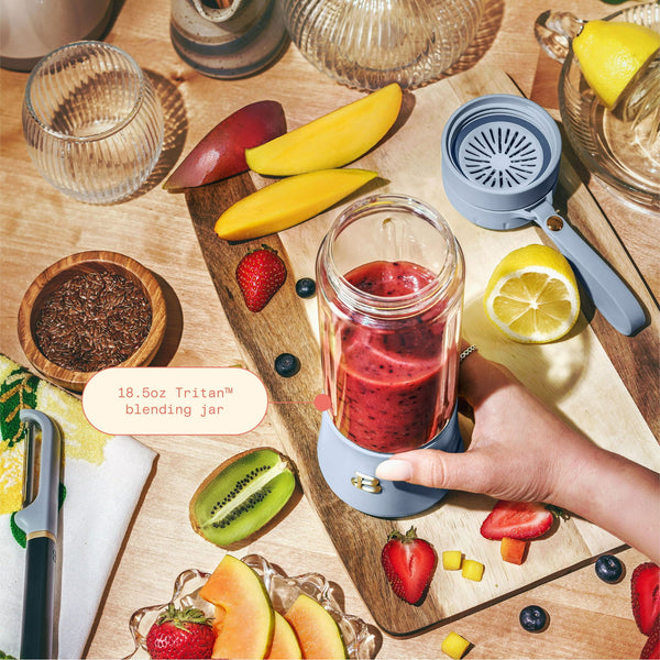 The beautiful™ rechargable portable to-go blender, 18.5 oz has a compact design that's ideal for small space living and on-the-go portability. Includes powerful rechargeable batteries that make 22 drinks in just one charge. Durable 4 tip stainless steel blending blade blends nutritious smoothies, iced drinks and much more. Blending jar and lid are dishwasher safe for hassle free cleaning. Created by drew barrymore, beautiful kitchenware™ combines elegant design, contemporary colors and modern silhouettes for high-performance cookware that looks beautiful anywhere you take it.