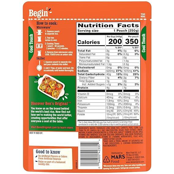 Water, Parboiled Long Grain Rice, Peas, Carrots, Canola and/or Sunflower Oil, Seasoning Blend [Salt, Maltodextrin, Sugar, Yeast Extract, Caramel Color, Onion Powder, Natural Flavor, Tumeric (Color), Spice, Garlic Powder, Iron (Ferric Orthophosphate), Niacin, Thiamin (Thiamine Mononitrate), Folate (Folic Acid)].