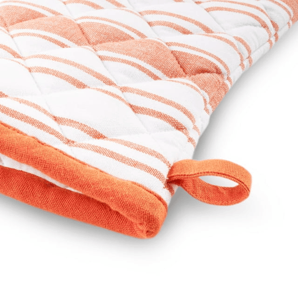 No one denies that the kitchen is the heart of the home and the ultimate gathering spot for family and friends. Better Homes and Gardens kitchen textiles will be a welcomed addition to your savvy kitchen design with colors and prints that is sure to enhance your kitchen décor and be useful in everyday tasks. Our aprons are designed to protect any chef’s clothes from splatters and stains, while our oven mitts and potholders protect hands from heat and burns. The french stripe, cotton apron features two front pockets perfect for keeping a thermometer, pen, and recipes close by. The adjustable neck strap and sewn-in waist ties assure a comfortable fit. The coordinating oven mitt and potholder include hanging hook for easy storage or to display as part of your kitchen decor. The Better Homes and Gardens Apron, Oven Mitt and Potholder Set provides protection when cooking and baking. The 3-piece set includes 1 apron measuring 24"W x 34"L, 1 oven mitt measuring 7"W x 13"L, and 1 square potholder measuring 8"W x 8"L. The Better Homes and Gardens Apron, Oven Mitt, and Potholder Set is made of durable 100% cotton and is machine washable for easy care. Available in multiple trendy colors to match any kitchen décor.