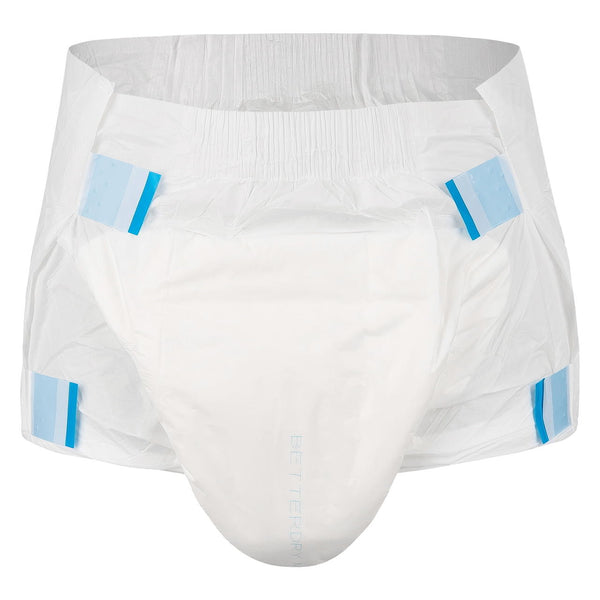 The BetterDry Day Adult Diaper with Plastic Backing is a discreet solution for day time use. Despite being a little thinner than other diapers, they still provide sufficient protection to last through the day. The super-absorbent core efficiently traps up to 25 oz. or 730 ml, keeping you feeling dry and at ease throughout the day.