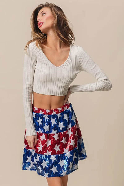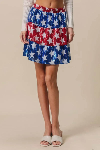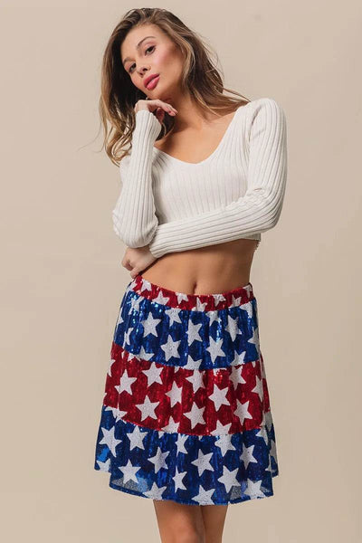The American Flag Theme Star Sequin Tiered Skirt is a festive and eye-catching piece that is perfect for patriotic celebrations and events. With its star sequin detailing and tiered design, this skirt exudes a fun and playful vibe. The American flag theme adds a patriotic touch, making it ideal for holidays like Independence Day or Memorial Day. Pair this skirt with a simple white top or a denim jacket for a stylish and spirited outfit that shows off your American pride in a fashionable way.