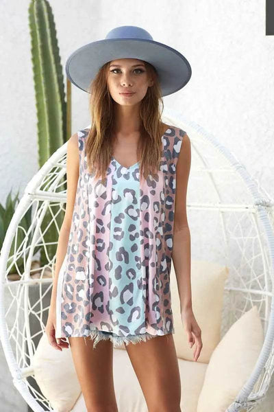 The leopard printed jersey knit color block sleeveless top is a bold and stylish choice for your wardrobe. The leopard print adds a touch of wild flair, while the color block design provides a modern twist. The jersey knit fabric offers a comfortable and stretchy feel, perfect for all-day wear. This sleeveless top is versatile and can be dressed up with tailored pants or down with jeans for a casual look. Elevate your style with the leopard printed jersey knit color block sleeveless top for a trendy and eye-catching ensemble.