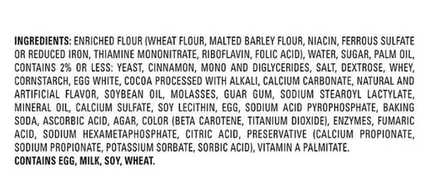 Enriched Flour (Wheat Flour, Malted Barley Flour, Niacin, Ferrous Sulfate Or Reduced Iron, Thiamine Mononitrate, Riboflavin, Folic Acid), Water, Sugar, Palm Oil, Contains 2% Or Less: Yeast, Cinnamon, Mono And Diglycerides, Salt, Dextrose, Whey, Cornstarch, Egg White, Cocoa Processed With Alkali, Calcium Carbonate, Natural And Artificial Flavor, Soybean Oil, Molasses, Guar Gum, Sodium Stearoyl Lactylate, Mineral Oil, Soy Lecithin, Egg, Sodium Acid Pyrophosphate, Baking Soda, Calcium Sulfate, Ascorbic Acid, Preservative (Calcium Propionate, Sodium Propionate, Sorbic Acid, Potassium Sorbate), Enzymes, Fumaric Acid, Color (Beta Carotene, Titanium Dioxide), Citric Acid, Vitamin A Palmitate, Agar, Calcium Lactate.