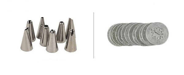 Accessories: 13 stainless steel cookie press molds and 8 pastry piping nozzles
