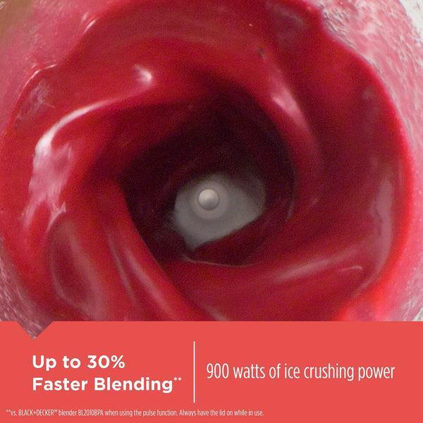 Less noise. More power*! The black+decker quiet blender with cyclone® glass jar features an innovative design that significantly reduces the noise of blending for a more pleasant blending experience. It delivers on performance, too, with up to 30% faster blending**. 6-tip serrated blade technology works with the cyclone® glass jar to create a powerful vortex that efficiently blends all types of ingredients. The range of speed settings includes 3 smart pre-programmed functions that deliver ideal results for smoothies, icy drinks, and shakes. Plus, the 900w motor and pulse function make quick work of ice, smoothies and frozen fruits. The 24-oz. Tritan® personal jar is perfect for taking shakes and other blended drinks on the go. Cleanup is easy, too, with dishwasher-safe removable parts and a sealed control panel that wipes clean in no time. *than black+decker™ bl2010bpa (1) less noise based on high speed assessing decibel value and loudness value at standard voltage; (2) more power based on peak power **vs. Black+decker™ blender bl2010bpa when using the pulse function ^peak performance refers to the maximum power recorded for 100ms during blending.