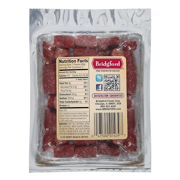 Bridgford Beef Snack Bites is made from premium beef, expertly seasoned and crafted into bite-sized delights. Our meat snack bites are a wholesome source of protein and energy, free from artificial flavors, colors, and preservatives. With its tender texture and bold flavor, these snack bites are a delicious way to satisfy your cravings anytime, anywhere.