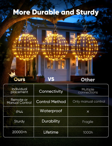 - Outdoor Christmas Sphere Lights with 8 Lighting Modes: This set includes three 12-inch foldable globe lights, each featuring 120 warm white LEDs. These hanging sphere lights offer eight distinct lighting modes: combination, wave, sequential, slow glow, chasing/flash, slow fade, twinkle/flash, and steady on.