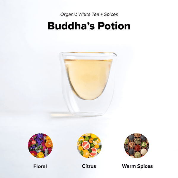 Buddha's Potion is a specialty white tea blend featuring floral notes, warm spices, mild citrus, and herbal flavors for a calming and well-rounded brew.