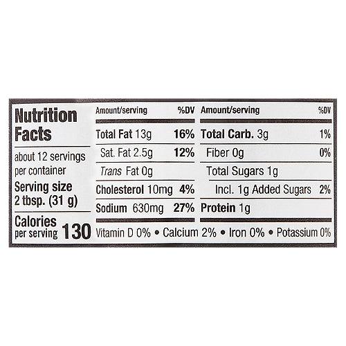 Soybean Oil, Water, Distilled Vinegar, Parmesan Cheese (Milk and Part Skim Milk, Cheese Cultures, Salt, Enzymes), Salt, Garlic, Corn Syrup, Egg Yolk, Spices, High Fructose Corn Syrup, Modified Corn Starch, Cornstarch, Garlic (Dehydrated), Maltodextrin, Shallots, Xanthan Gum, Potassium Sorbate and Sodium Benzoate Added to Maintain Freshness, Lemon Juice Concentrate, Propylene Glycol Alginate, Glucono Delta Lactone, Artificial Flavor, Citric Acid, Onion (Dehydrated), Lactic Acid, Canola Oil, Sesame Seed Oil, Calcium Disodium EDTA Added to Protect Flavor.