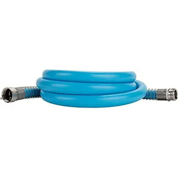 Camco’s EvoFlex 10-Foot Drinking Water Hose with 5/8-inch ID is ideal for RV and marine use. Its extra flexible construction holds no memory, making it easier to position and store and made of PVC. Features nickel-plated machined fittings and stainless steel strain reliefs on each hose end. Drinking water safe with a lead-free, BPA-free and phthalate-free formulation. The blue hose leaves no strong plastic taste in your water. UV stabilized for a long life. Color: Blue. Model#: 22592