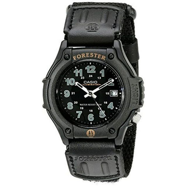 The large, easy-to-read face on the Casio Men's Electro-Luminescent Forester Sport Watch make it a favorite workout accessory for athletes. This durable timepiece is constructed with a lightweight 41mm resin case, a stationary black stainless steel bezel, and a comfortable black nylon wristband with an adjustable buckle clasp for a personalized fit. A durable mineral window shields the black dial face, which features gray Arabic numeral hour indexes, complementary silver-tone watch hands, and a discrete 24-hour clock display. The quartz-powered watch includes a date calendar at three o'clock and is water resistant to 100 meters.