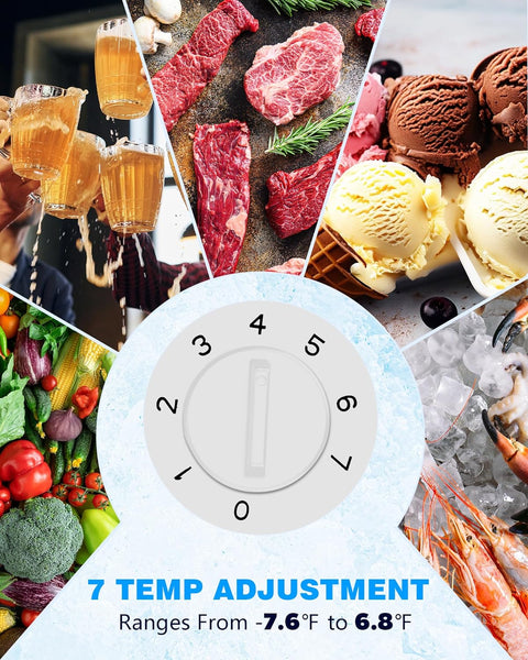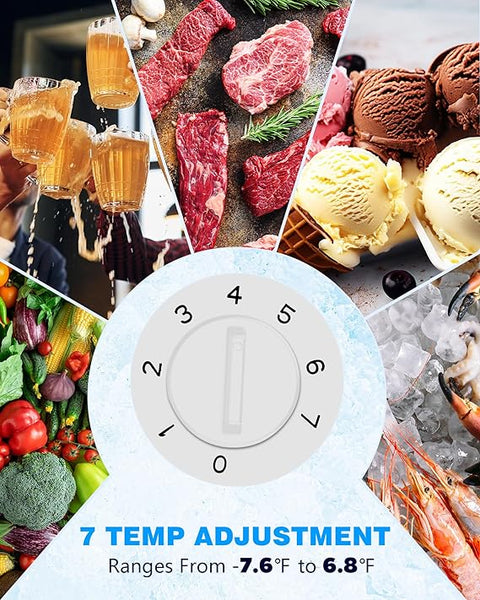 - 【7-Stage Adjustable Thermostat】The compact freezer is designed with 7 temperatures that allows you to freeze as many items as you need, ranging from -7.6°F to 6.8°F. Keep your items at the ideal temperature for optimal freshness. A "0" on the thermostat dial indicates that refrigeration has stopped.