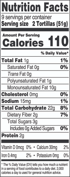 White corn masa flour (white corn flour, propionic acid [preservative], guar gum, cellulose gum, benzoic acid [preservative], phosphoric acid, enzymes [to preserve freshness], trace of lime), water, contains 2% or less of calcium sulfate, xanthan gum, cellulose gum, guar gum, enzymes, propionic acid (preservative), sodium hydroxide, methyl paraben (preservative), propyl paraben (preservative).