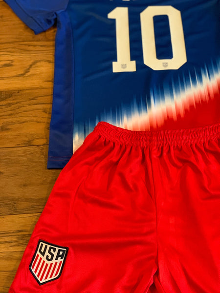 Christian Pulisic Kids Soccer Jersey Set Set Football Youth Toddler Sizes. Futbol Youth Toddler Football Shirt and Shorts matching set. Toddler Youth Tshirt Awesome Youth Soccer Jersey and shorts set of 2. Size 2T, 3T, 4T, 5T, Extra Small, Small, Medium, Large, Extra Large, 18, 20, 22, 24, 26, 28, 30. All in stock ships within 12 hours from order time. We ship from Missouri. All soccer jerseys are brand new and never tried on. Amazing Screen Printing & Embroidery.