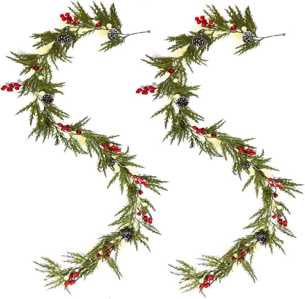 - 🎄【CHRISTMAS CYPRESS PINE GARLAND LIGHTS】This 6FT Christmas cypress pine garlands with 20 LED warm white bulb lights, 8 red bettries branch, 5 big pine cones, 5 red bells and denser green branches. This artificial pine garland offers a realistic design that mimics the beautiful and natural charm of real pine. The Xmas garland is much lush and full of a Christmas atmosphere