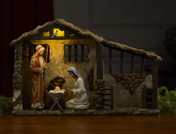 - LED lighted stable that provides warm ambient lighting to nativity seen (Includes batteries)