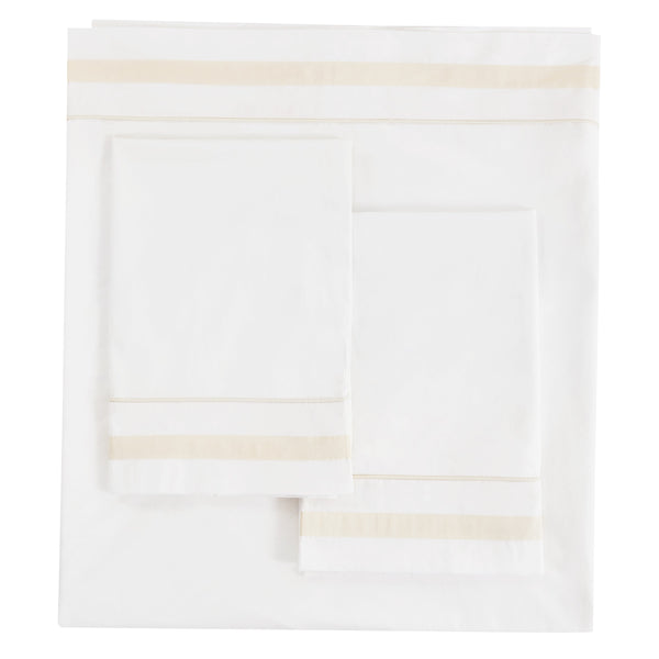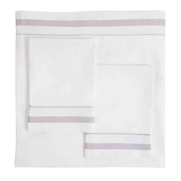 We weave our Percale sheets by laying one warp thread over one weft thread in a one-to-one ratio. This produces a sheet with a matte finish that is soft yet durable, crisp and cool to the touch. We added a tailored band and piping to the edge for sophisticated luxury and style.
