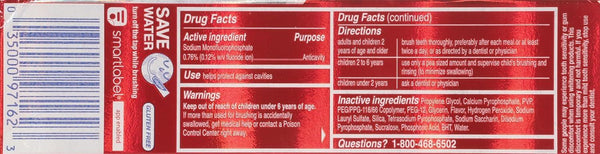 Active Ingredients: Sodium Monofluorophosphate (0.12% w/v Fluoride Ion) (0.76 %), Anticavity. Inactive Ingredients: Propylene Glycol, Calcium Pyrophosphate, PVP, PEG/PPG 116/66 Copolymer, PEG-12, Glycerin, Flavor, Hydrogen Peroxide, Sodium Lauryl Sulfate, Silica, Tetrasodium Pyrophosphate, Sodium Saccharin, Disodium Pyrophosphate, Sucralose, Phosphoric Acid, BHT, Water.