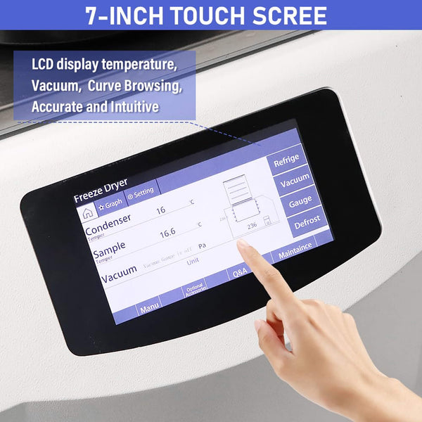 This freeze dryer is engineered for superior performance and user-friendliness. At its core is a robust SECOP compressor and an eco-friendly refrigeration system that brings the cold trap down to an impressive -60°C, ensuring a strong water capture capacity of up to 4kg. Forget the need for a separate low-temperature refrigerator—the integrated pre-cooling function saves you both space and cost! All operations are easily managed through a vibrant 7-inch color LCD touch screen, which clearly displays drying curves, temperature, and vacuum levels, giving you complete control and oversight of the entire process.