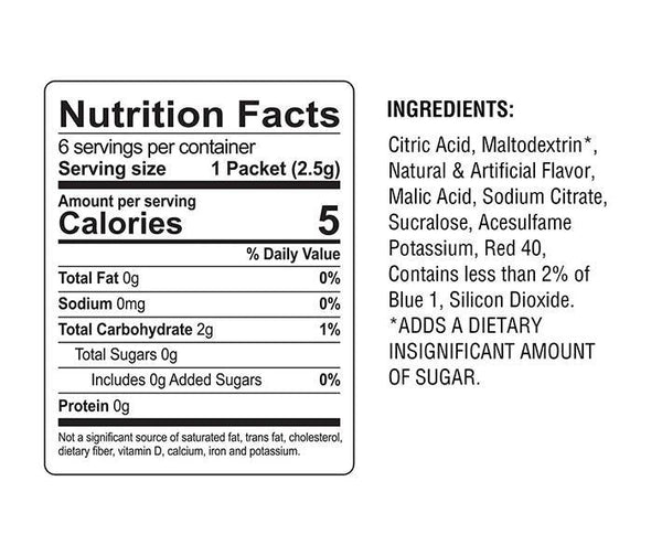Citric Acid, Maltodextrin, Natural & Artificial Flavor, Malic Acid, Sodium Citrate, Sucralose, Acesulfame Potassium, Red 40, Contains Less Than 2% Of Blue 1, Silicon Dioxide.